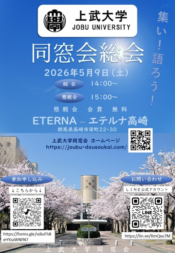 上武大学同窓会 定期総会・懇親会のお知らせ 日時:5月9日(土)14時開始 場所:エテルナ高崎 住所:群馬県高崎市栄町22-30